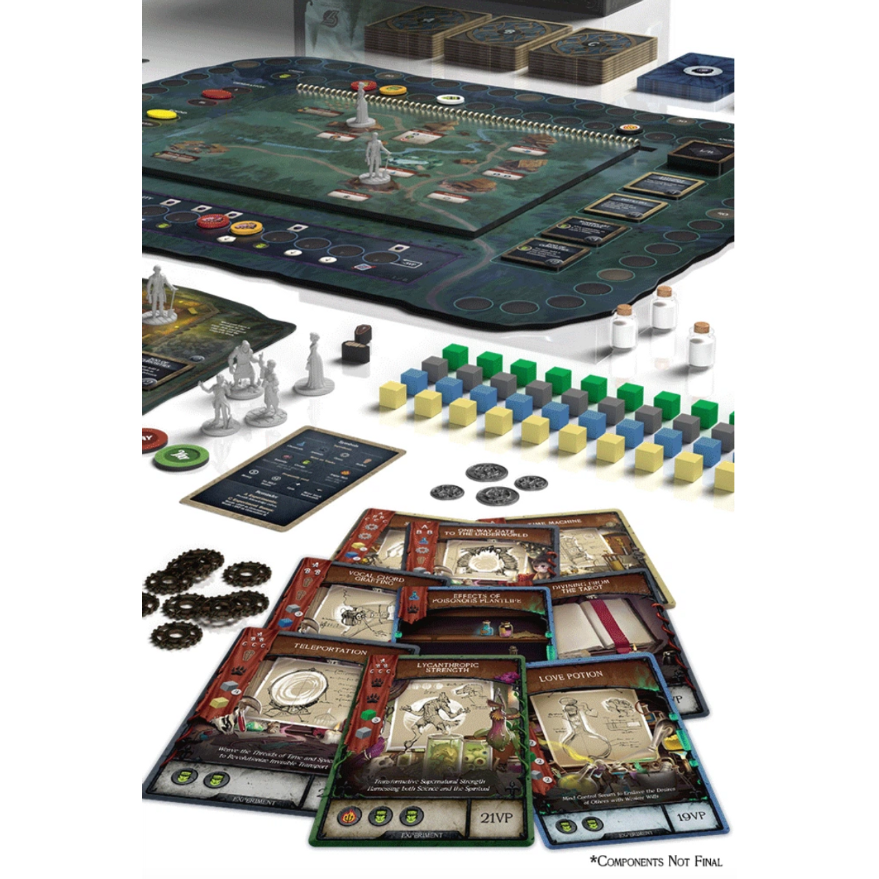 But they have to balance study and active experimentation because at the end of each generation, all of their experiments and resources are lost to time until their child begins again with only the "Journaled Knowledge and Estate" they have willed to them — and since the game is played over the course of three generations, it is inevitable that the players will rouse the townsfolk to form angry mobs or spiral into insanity from the ethically dubious works they have created. The player with the most points at the end of three generations wins and becomes the most revered, feared, ingenious scientist the world has ever known!