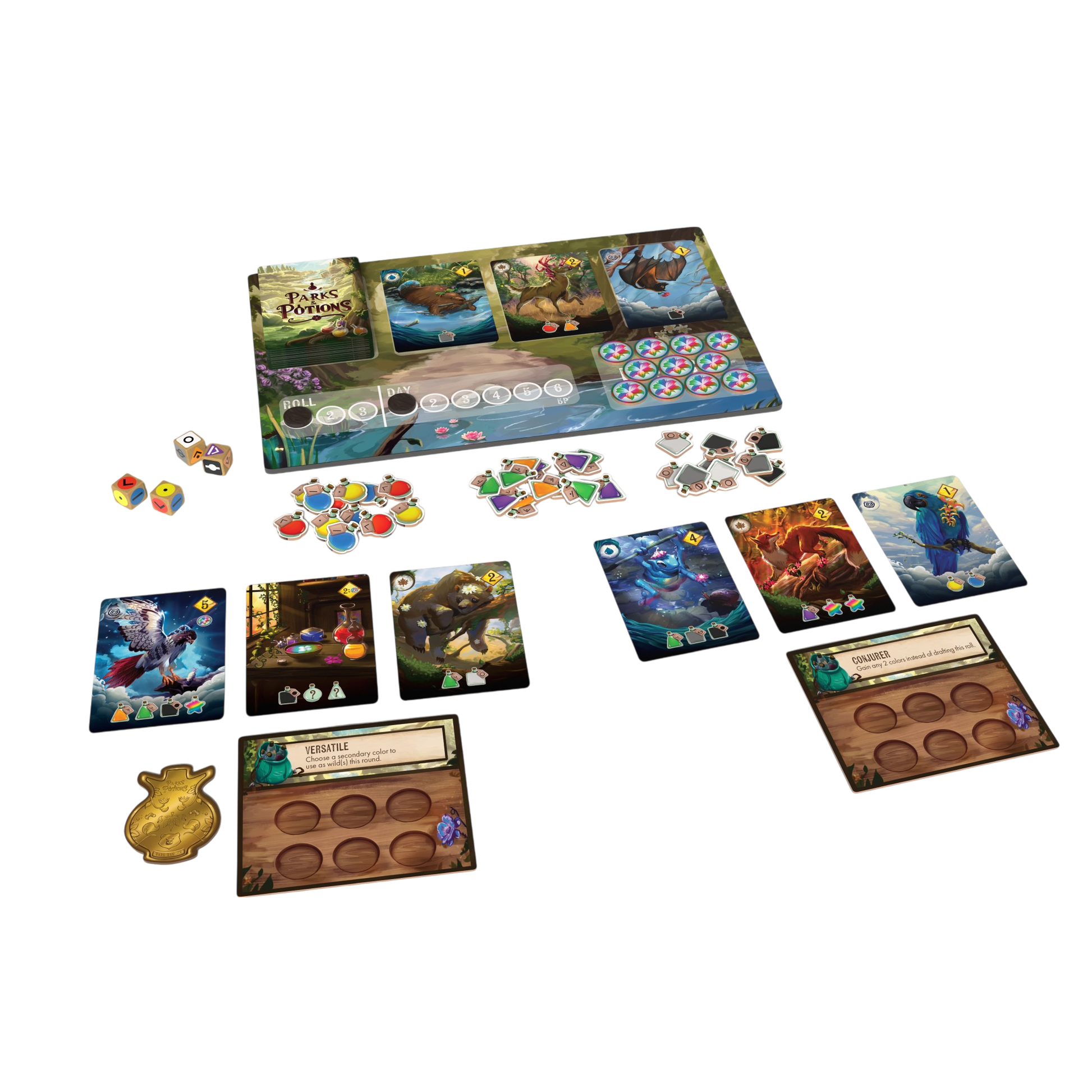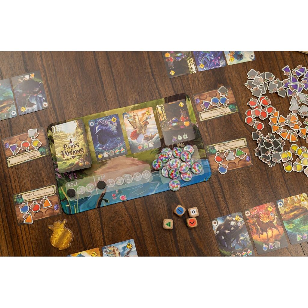 Parks & Potions plays over 5-6 rounds, each representing a day of work. The game is divided into phases in which players roll dice to discover flowers to extract, manage their inventories, and use potions to fulfill objectives and cure animals. Strategic potion mixing and objective completion are key to becoming the most renowned ranger.
