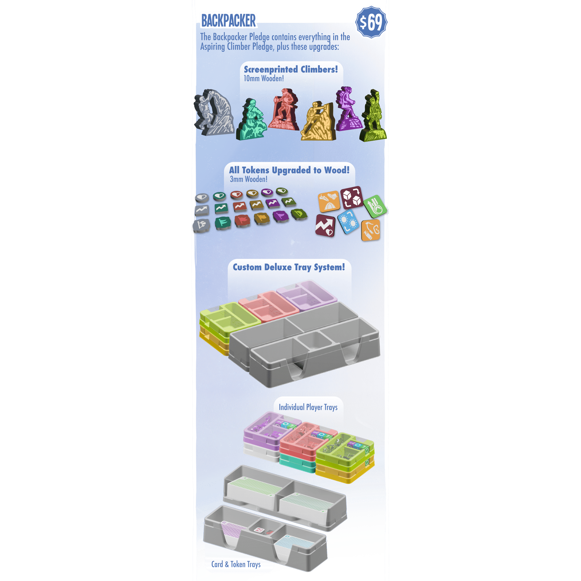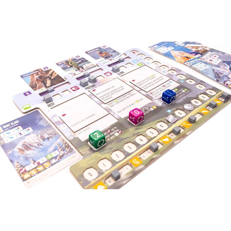On your turn, choose one of three actions: rest to regain your stamina; prepare to gain mountain passes and equipment; or climb to climb a mountain and reap its rewards. A "tag along" mechanism keeps players engaged even when it's not their turn, adding a collaborative element. Mechanical player mats with moving tiles and dials, a custom die, and flag minis make for a new, tactile experience.