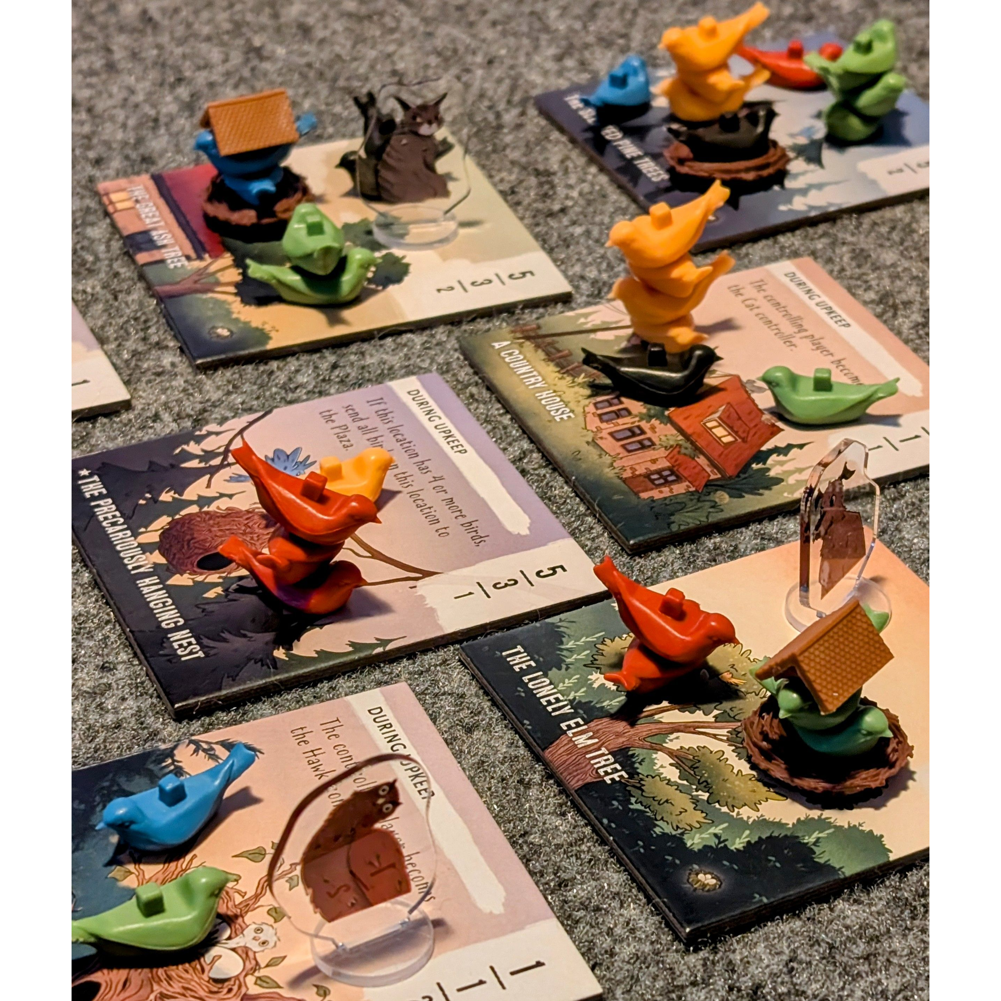 Players fight for control of locations by commanding birds of their own, and other players’ flocks. Earn points and command woodland creatures by having the most birds on a location, pushing your foes off the perch, and breaking ties to take the lead.