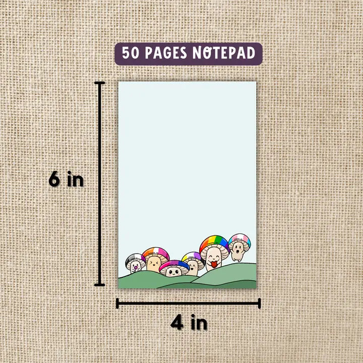 Snag this unlined notepad with a design of LGBTQIA+ mushrooms on the bottom.