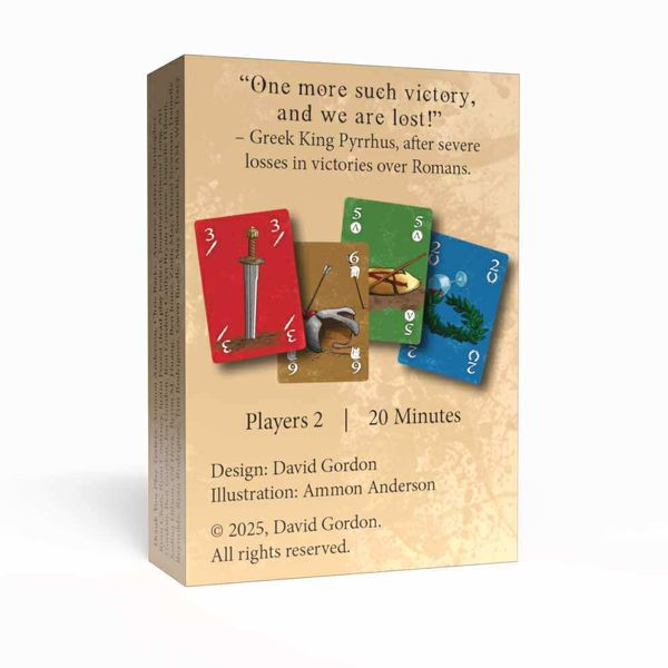 In Pyrrhic, the first to win 2 Battles wins the game. Each Battle has several Skirmishes. If you win a Skirmish, take all the cards and try to form melds. First to 4 melds wins the Battle. But be careful: if you have 7 or more cards that can’t meld, you lose the Battle!