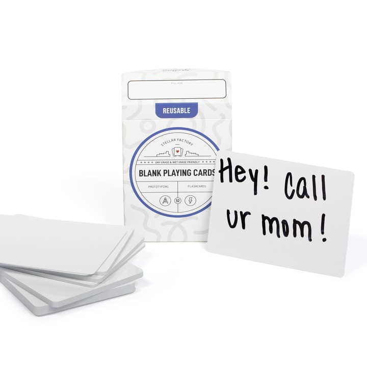 Our reusable blank playing cards are perfect for prototyping a new card game or preparing flashcards for that upcoming test. The cards are made with casino quality paper, are easy to shuffle and hold, and are compatible with both dry and wet erase markers.