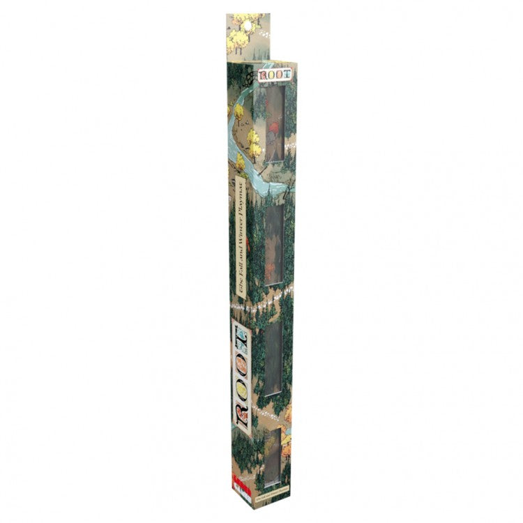 A deluxe double-sided playmat of the fall and winter game boards from the base game of Root.
