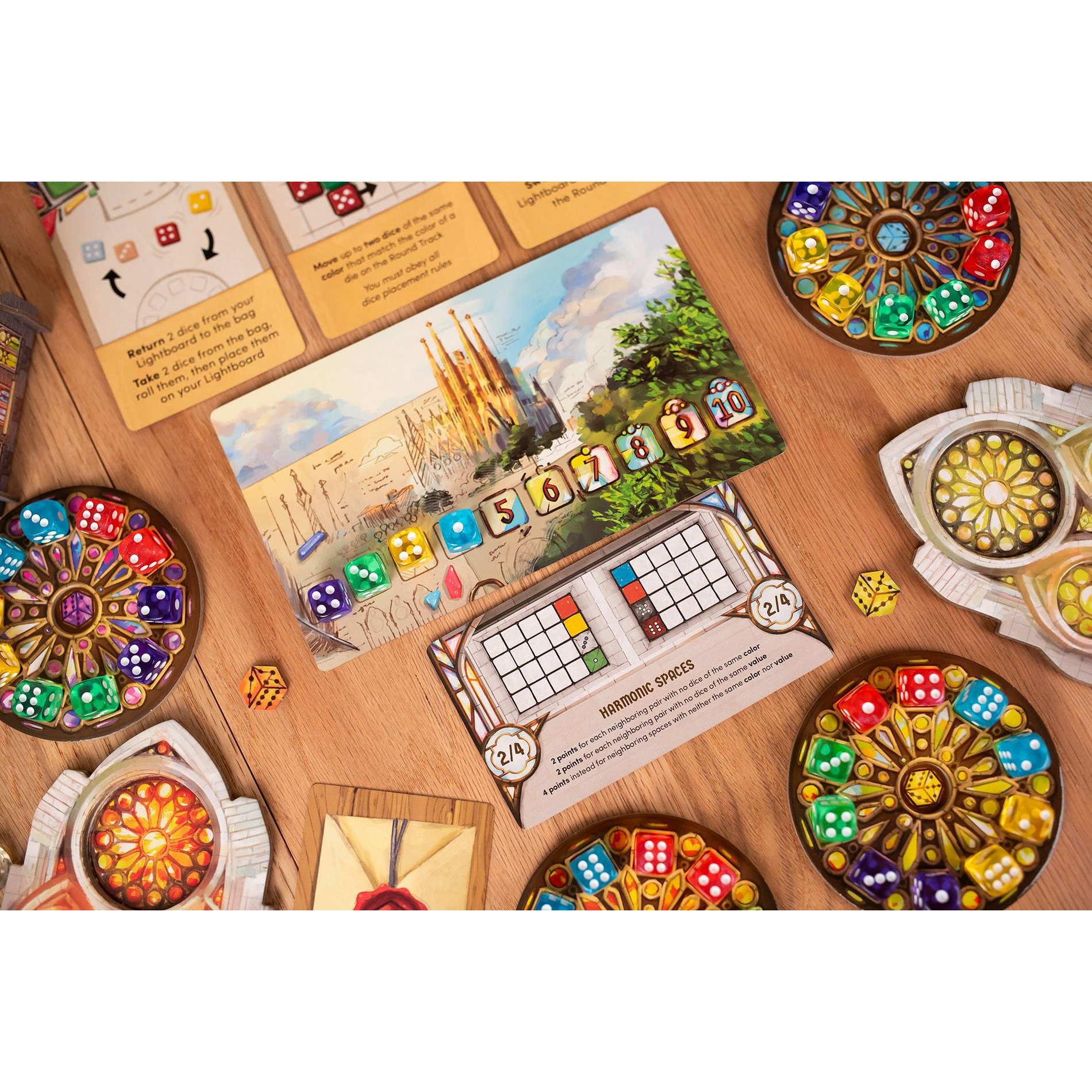 Sagrada: Panorama expands the brilliant puzzle game of dice, light and color with new plans, new constructions, and an all-new mechanism! With Panorama shared objectives, players work together to score points in all-new ways.
