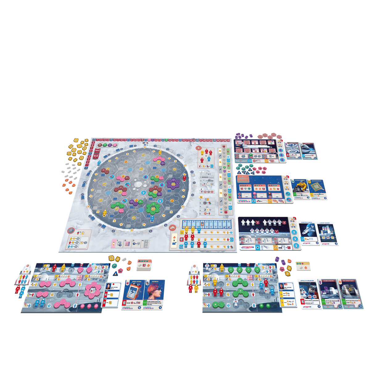 A permanent base is being built in the Shackleton crater at the Moon's South Pole. You're leading one of the space agencies that are working together to expand their presence on the base, while at the same time the three major corporations sponsoring the mission are each pursuing their own agenda. In Shackleton Base: A Journey to the Moon, you will build structures on the base, while also funding projects from the corporations that provide special abilities and scoring opportunities.