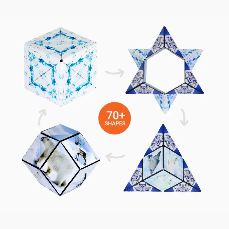Transforms into over 70 geometric shapes. Each Shashibo has 4 art designs - the outer design & 3 inner designs