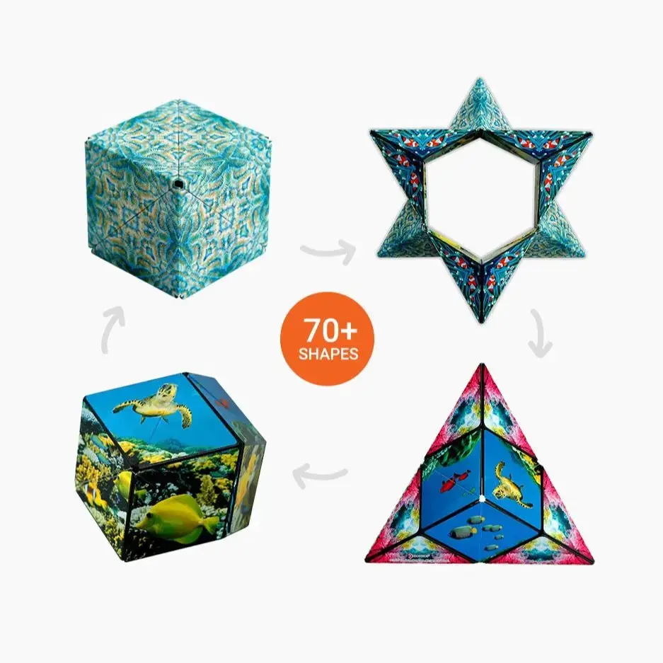 Transforms into over 70 geometric shapes. Each Shashibo has 4 art designs - the outer design & 3 inner designs