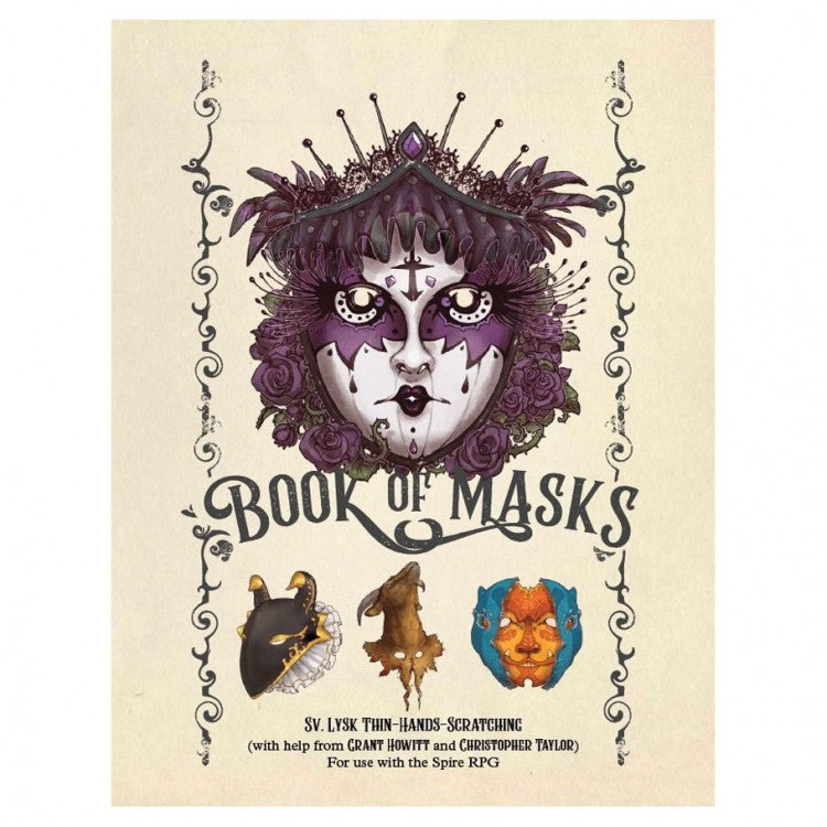 This softback supplement for the Spire RPG is written in-character as Lysk Thin-Hands-Scratching, a self-obsessed mask-maker to the rich and famous. In the Spire setting, all of the ruling high elf classes and their dark elf servants must wear masks in public at all times, and staying up to date with the latest trends is paramount. The Book of Masks is beautifully illustrated in full-colour by Iguanamouth and written by Grant Howitt and Christopher Taylor, the authors of the original Spire RPG. Inside are descriptions, illustrations and rules for 22 masks, such as: The Vizard Intravenous, which allows you to be strung-out on whatever drugs you like all; day due to cunning ampoules and injector ports; The Forevermask, which purports to slow the signs of aging but in fact bombards the; user’s face with near-fatal levels of radiation; The Coccoon Mask, a full-body lockable suit for unsightly staff members; The Thunderhelm, which has a big gun in it.