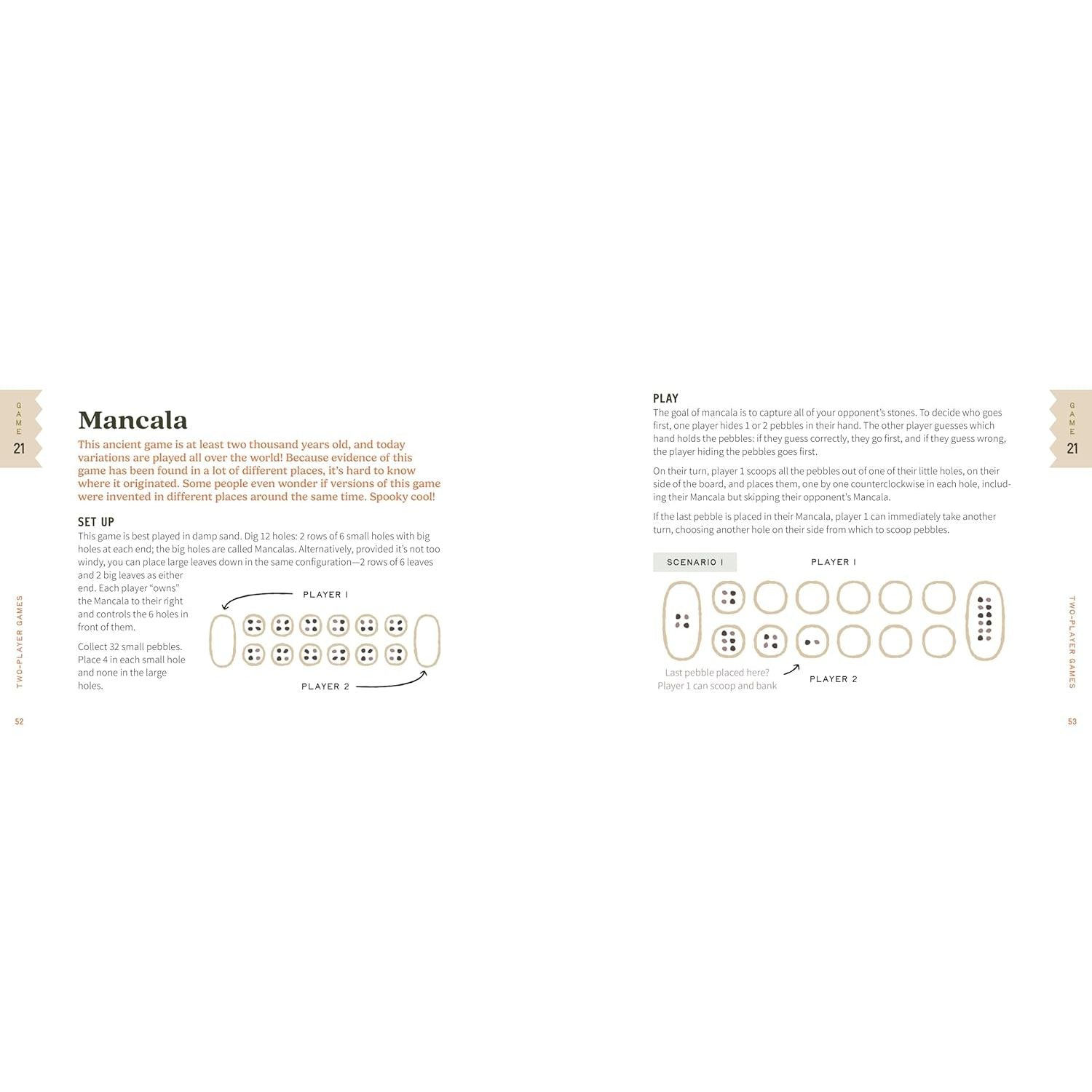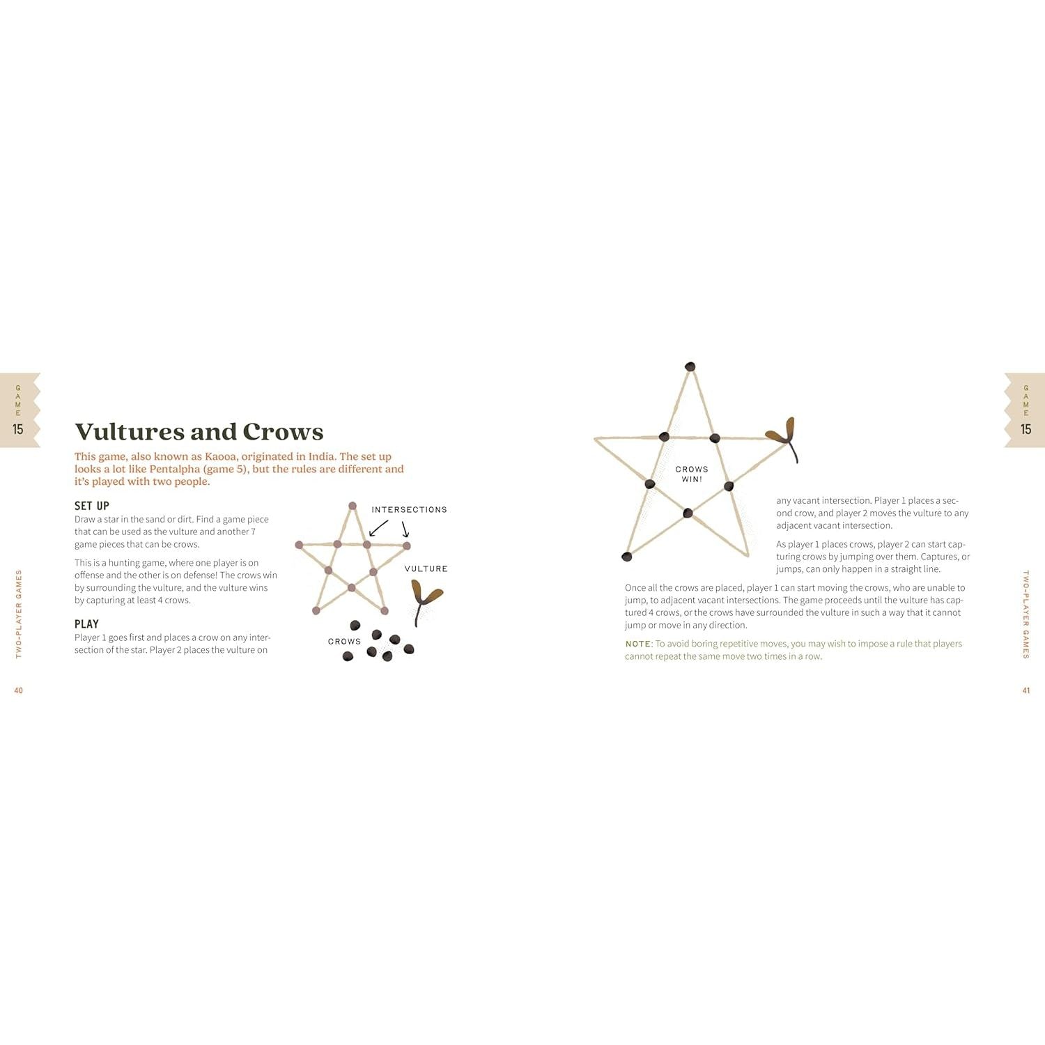 The featured games are grouped into single-player, two-player, and multiple-player options, with a focus on setups similar to the ever-popular board games people enjoy playing at home. From Nine Men’s Morris to Stick Solitaire to Neanderthal Poetry, every game has been vetted by the author and her family and friends in outdoor settings.