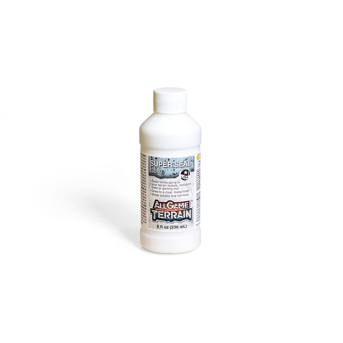 This spray adhesive seals landscape materials onto your terrain feature, miniature base or gaming mat. Super Seal™ goes on white and dries to a clear matte finish. Ideal for use with Flowers, Weeds, Sand, Gravel and more. Apply with Sprayer for an even application. Super Seal is water soluble and non-toxic.
