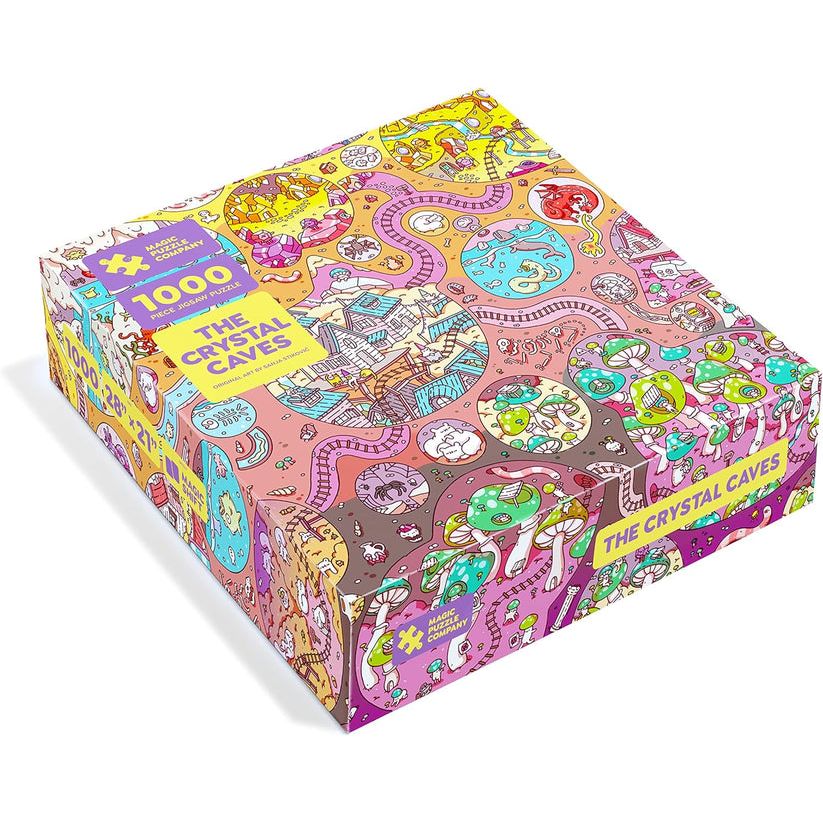 Magic Puzzle Company presents; The Crystal Caves. We’re using ideas from game design, optical illusions, and magic to make this the most interesting and engaging puzzle you've ever solved. Magic Puzzles are printed on premium Dutch puzzle cardboard so they snap together and stay put. Each puzzle comes with two large posters of the artwork so multiple people can all work together. And when you’re done, everything can be packed back into resealable bags so you can gift it forward. Magic Puzzles have NO puzzle dust in the box and have NO single-use or disposable plastic.