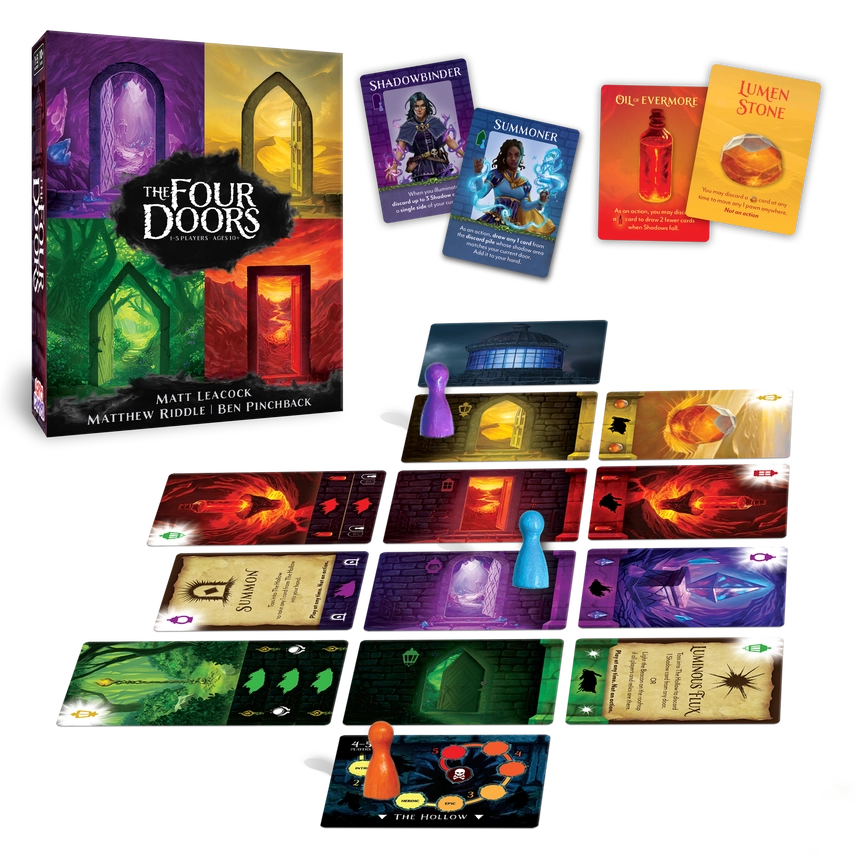 Race against the darkness! Join a band of daring adventurers on a quest to retrieve four sacred treasures hidden beyond the doors of a mystical light tower. Work together to explore the doors, unite the treasures, and ignite the beacon—before a swarm of sinister shadows engulfs the tower and the doors are sealed forever! Contents: 64 cards, 6 pawns