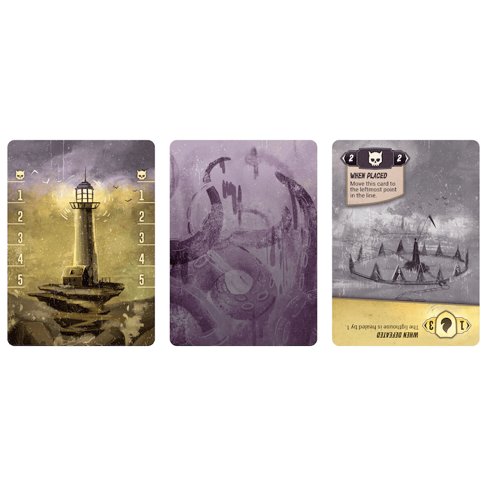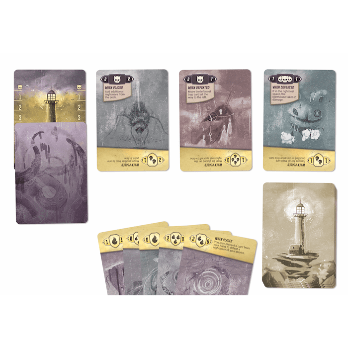 In The Last Lighthouse. your goal is to survive all of the cards in the Nightmare deck, keeping the Lighthouse lit despite the spreading darkness caused by any unchecked Nightmares. Each of the 16 Nightmare cards doubles as a Trap used to control or eliminate these threats, and each feature unique abilities that change up how they are placed or used.
