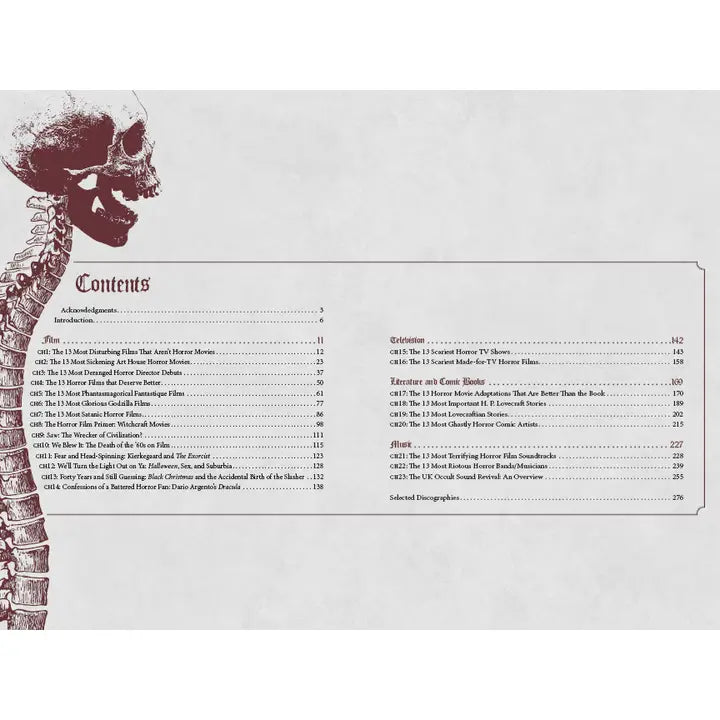 This collection of carefully curated lists, articles, and interviews celebrates the beleaguered horror genre across different media while tracing the history of its acceptance into popular culture. Divided into four sections—Film, Television, Literature & Comic Books, and Music—this book groups horror movies from the Silent Era to today, as well as classic horror books and cult musical albums, into top-13 lists. Enjoy detailed reviews and analysis in categories such as the 13 Most Deranged Horror Director Debuts, the 13 Horror Movie Adaptations That Are Better Than the Book, and the 13 Most Terrifying Horror Film Soundtracks. These chapters, together with in-depth conversations with musicians, demonstrate how horror has penetrated our culture in more ways than we know.