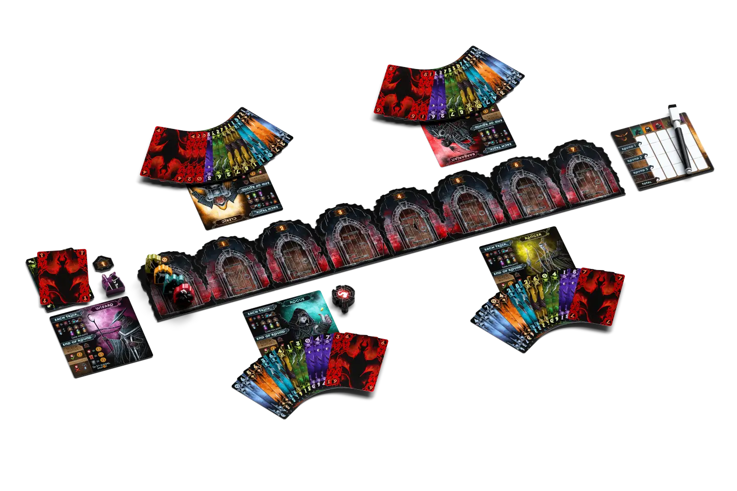 In this trick-taking game, you must decide when to win tricks and when to increase the value of the number of tricks you think you might take. However, points are limited, so if any players end up taking the same amount of tricks, they must divide the points among themselves. After 3 rounds of play, the player with the most points wins!