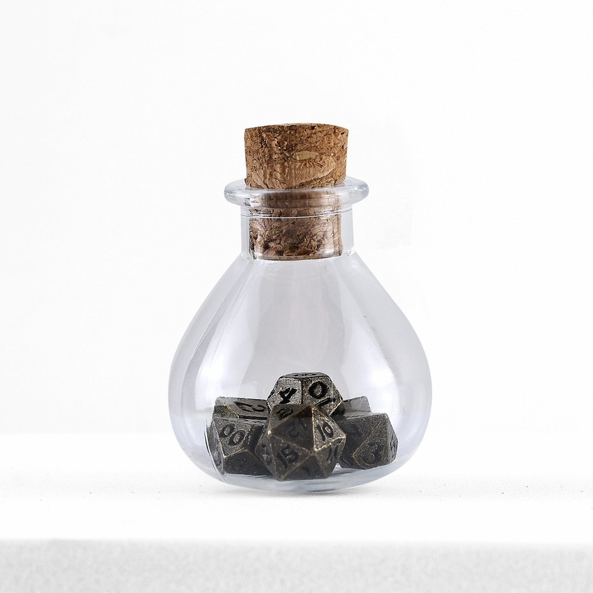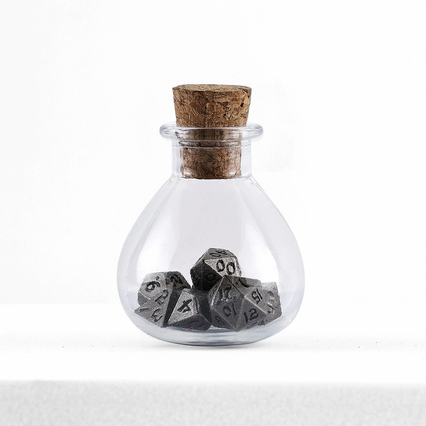 Set of 7 mini solid metal polyhedral dice in a metallic finish. Each set comes in a tiny potion bottle!