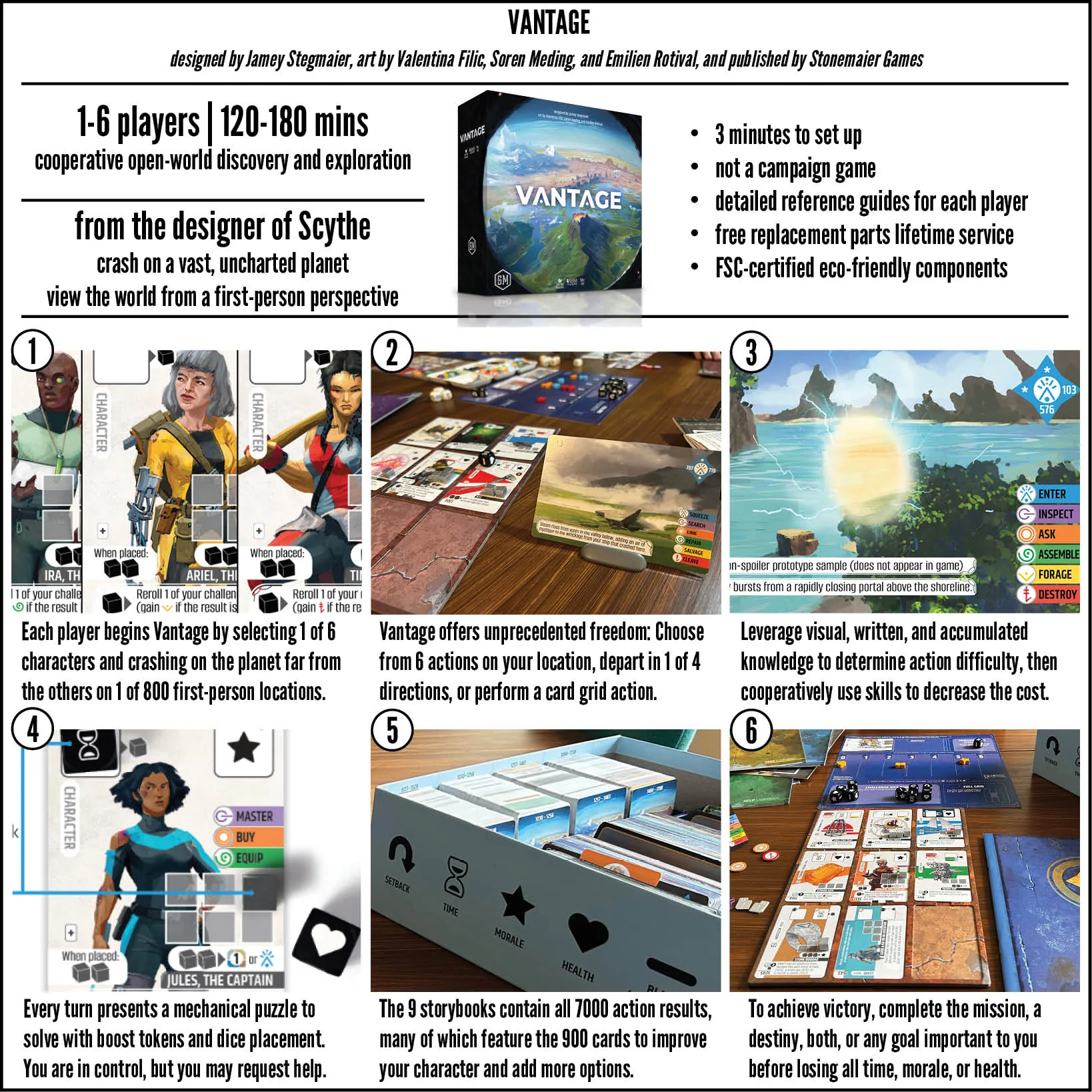 Vantage is an open-world, cooperative, roguelike adventure game for 1-6 players designed by Jamey Stegmaier. Vantage features an entire planet to explore, with players communicating while scattered across the world. With nearly 800 interconnected locations on cards and over 900 other discoverable cards, the world is your sandbox.