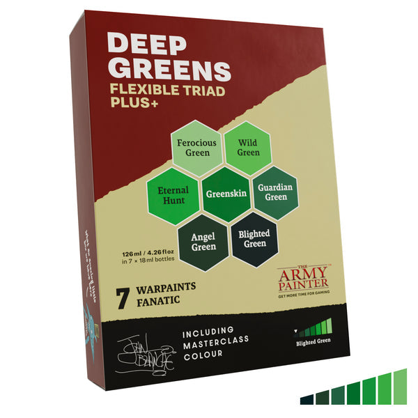 Wander into verdant forests and bring legendary woodland creatures to life with the Flexible Triad PLUS+ Deep Greens. These vibrant colours capture everything from foliage to light moss to the skin of orks and ogres. This set of seven progresses from the dark hue of trees to the bright green of a sunlit meadow. John Blanche: Blighted Green gives you the option for a more sinister base.