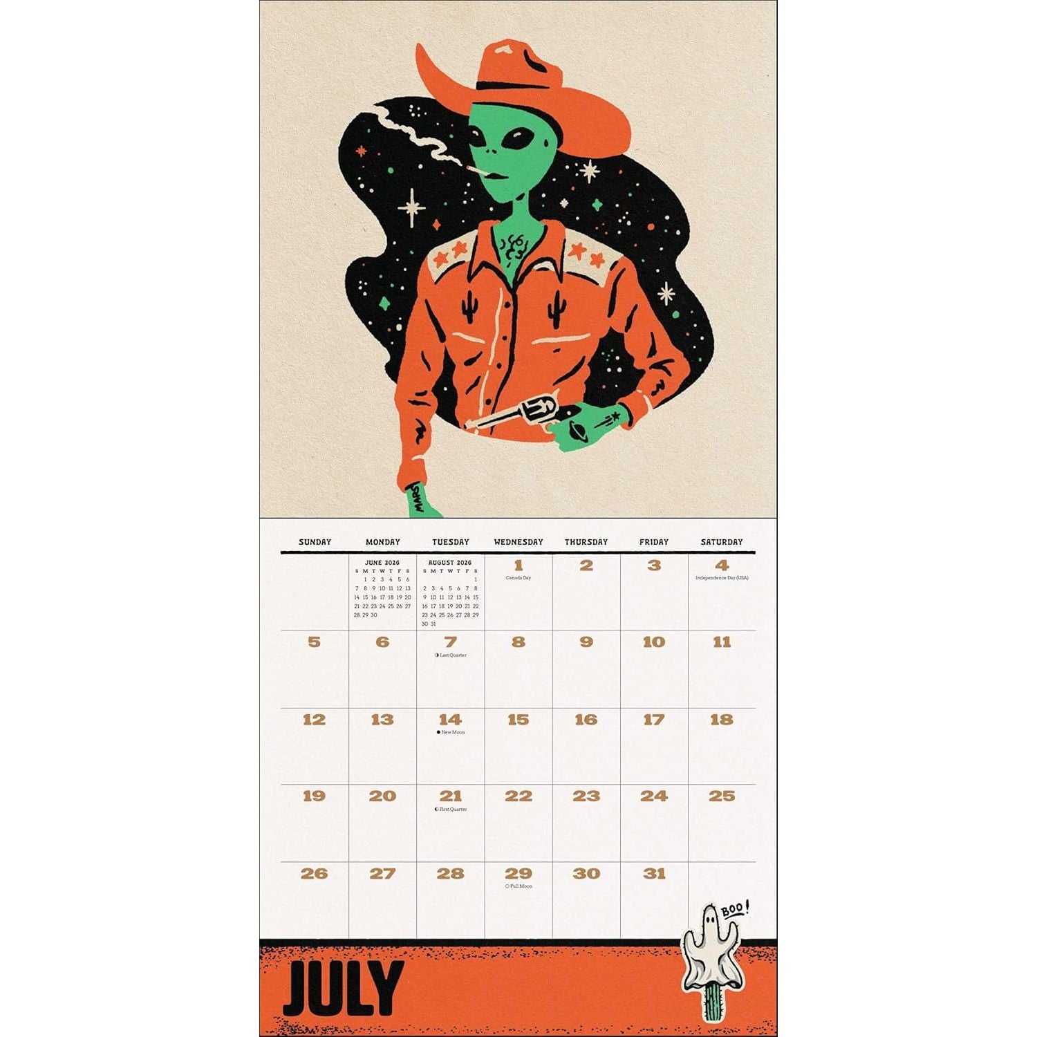 Featuring a fun and surprising cast of western-gothic images, this 2026 wall calendar based on the popular artwork of designer Sam Larson (@samlarson) brings a dash of surrealism and a hard-hitting rockabilly vibe to any wall. Combining everyday western-themed objects such as beer cans, flowers, and cowboy boots, with spooky subjects (Ghosts! Aliens! Vampires!), this edgy aesthetic is sure to appeal to fans of vintage Americana and lovers of paranormal lore. Saddle up for a year full of eerie excitement and retro charm.