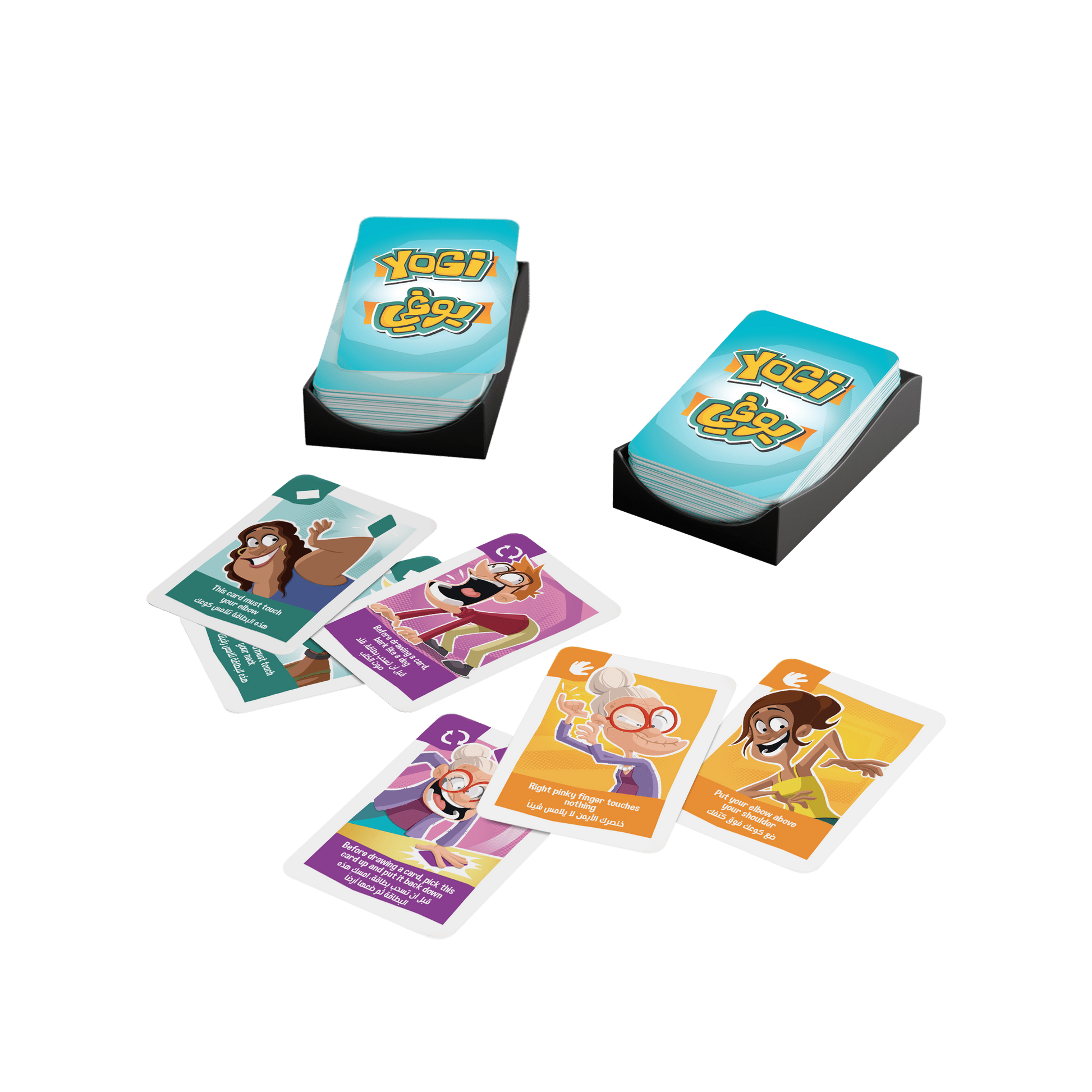 In Yogi, players are challenged to contort their bodies in unusual ways, ideally doing better than everyone else in their impersonation of a pretzel! On a turn, a player reveals the top card from the deck. If the card is red, the player must place or hold the card somewhere on their body as directed by the card; if the card is green, the card itself can stay on the table, but the player must do whatever is specified on the card, such as keeping one thumb on your chin or having your hands touch. Keep going, and stay flexible!