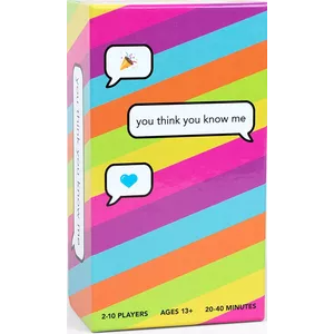 You Think You Know Me playfully tests how well you know your friends, giving you a chance to learn more about what they love and who they are. Each player starts with seven cards in hand, cards that say things like "I know that your secret talent is ________" or "I know that you would/wouldn't want to live forever." On a turn, you pick another player, play a card from hand, and say how you think they would answer the question. If you're right, you discard the card; if not, you have to draw a new card and add it to your hand. Whoever first discards all their cards wins.